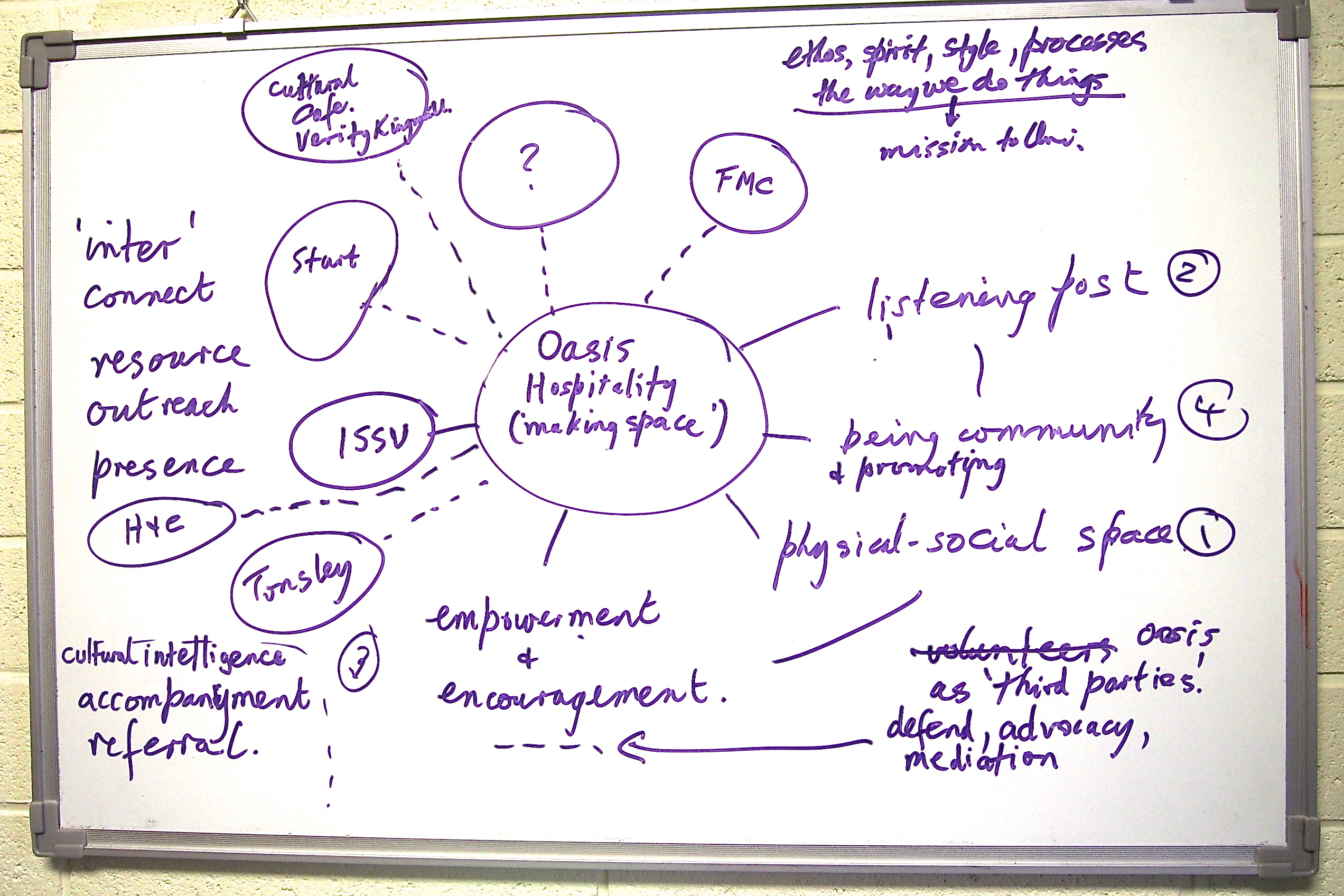 When these contacts are outside the realm of Oasis, the process of hospitality may lead to partnerships or collaborations with other agencies. Oasis can act as a hospitable go-between or facilitator. It can share its experiences of the hospitality process with others and enable others to achieve their own goals.